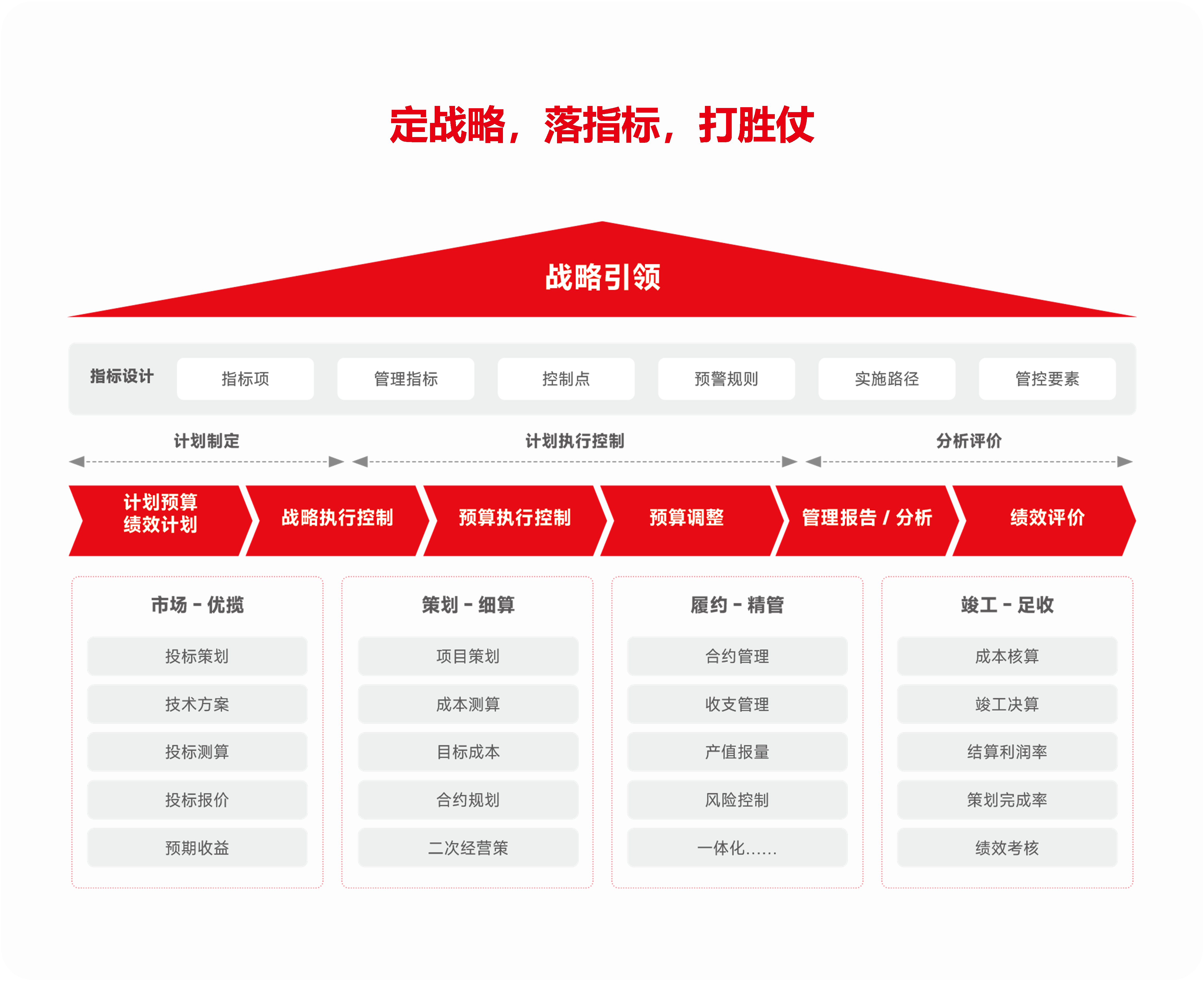 建筑地产企业发展新质生产力,离不开周密的战略规划引领。从战略出发,细化为具体指标,进而转化为可执行的预算,并通过执行监控、分析报告和绩效评估等环节,数智化充分赋能企业战略可执行可落地。同时,确保战略执行与企业目标一致,并能够灵活调整以适应外部环境的变化,从而构建和提升企业的“战略引领力”,使之在竞争激烈的市场环境中赢得竞争。