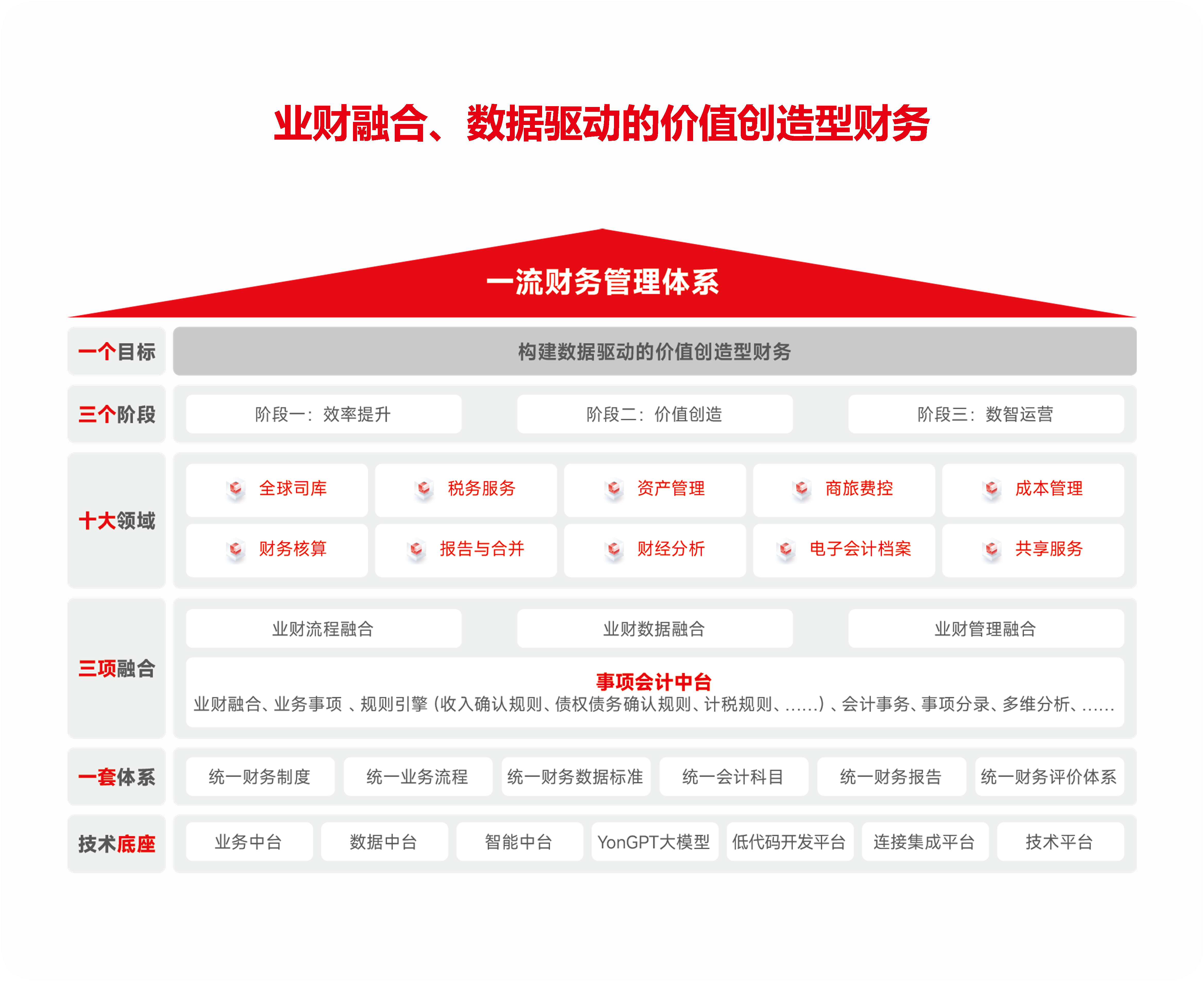 以“构建业财融合、数据驱动的价值创造型财务”为目标,基于新一代数智化技术构建一流财务管理体系,提供包含技术底座、体系完整、基于事项会计中台的业财融合解决方案,实现业财与流程、数据、管理的全方位融合,赋能企业全面的效率提升、价值创造,也为数字化、智能化运营奠定坚实的基础。