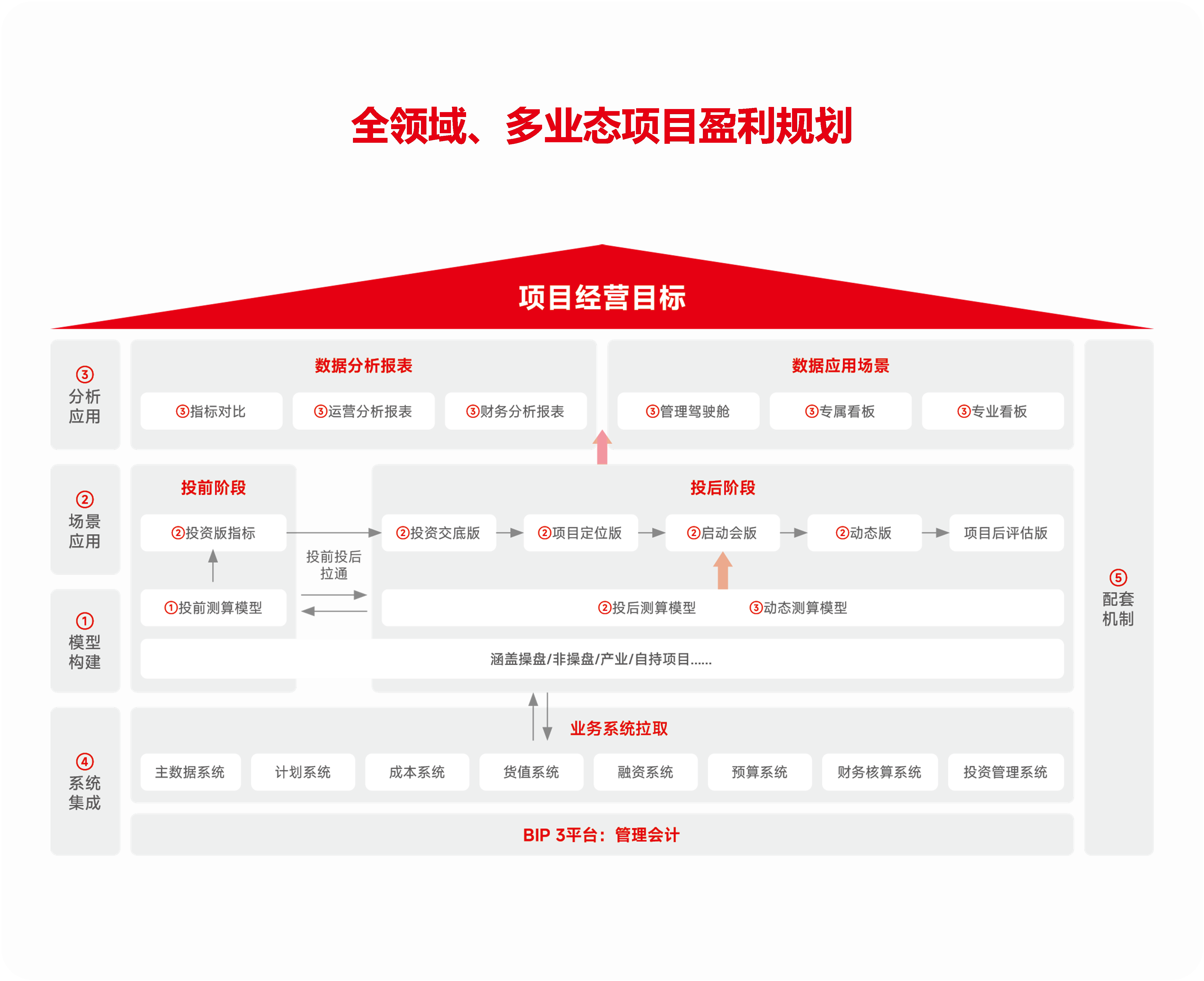 项目全生命周期经营管理系统是实现企业内外部数据连通,实现企业经营策略数字化、经营监控常态化、经营决策精准化的有效工具。基于用友BIP平台,助力企业通过数据建模和数据应用,实现项目全周期经营利润和资金安全的动态管控,做到项目盈利心中有数,也为企业建设业财融合的全面预算管理系统打下了良好基础。