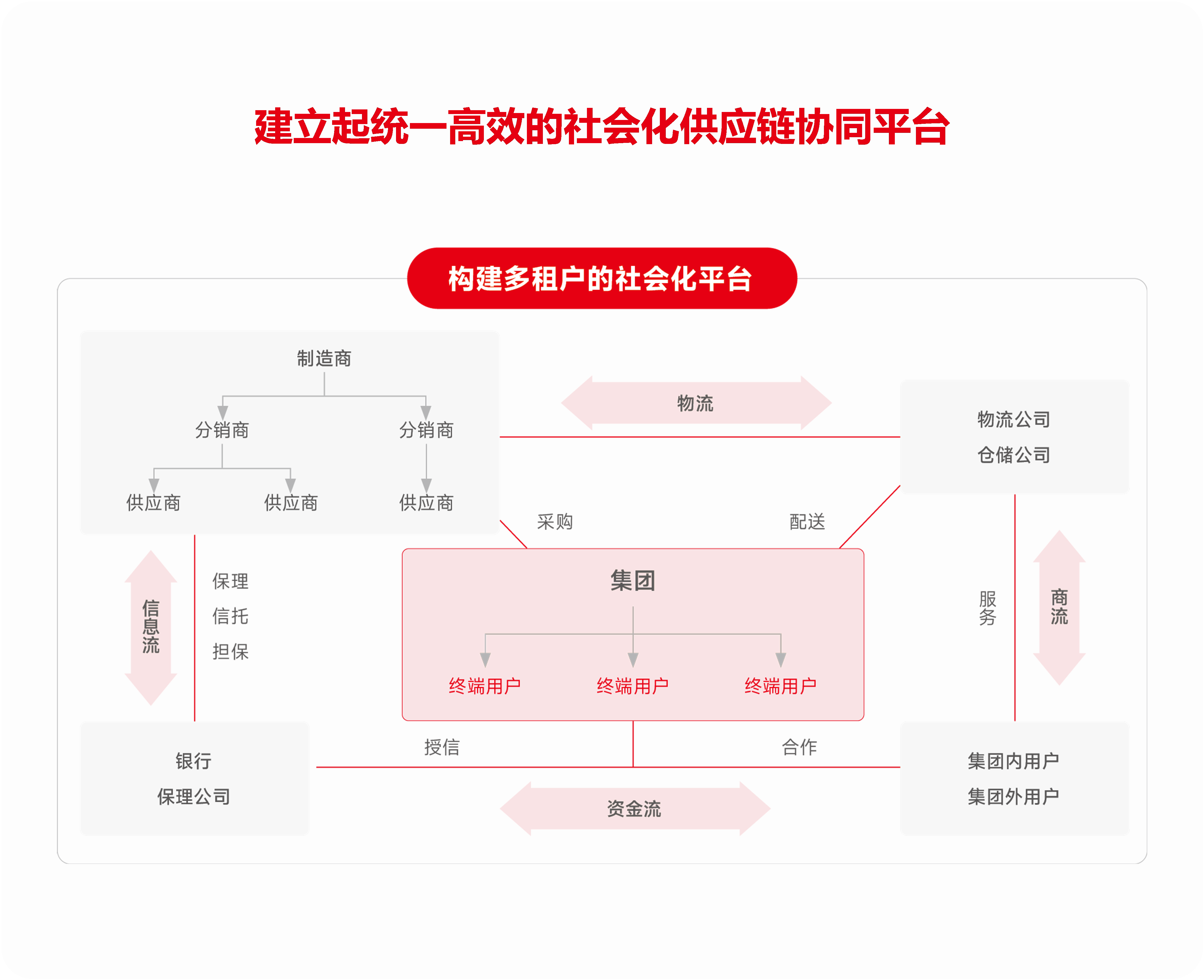 基于用友BIP高效互联平台,实现从寻源、招标、合同、订单执行的采购业务全程数智化、可视化、公正化,赋能企业阳光采购。突破传统的单一企业集团采购平台思维,以集团为核心采购单位,进行水平、上游、下游资源的整合,建立起统一高效的社会化供应链协同平台,实现企业招采供应业务一体化精细管理以及业财税一体化风控管理,并助力企业降本增效。