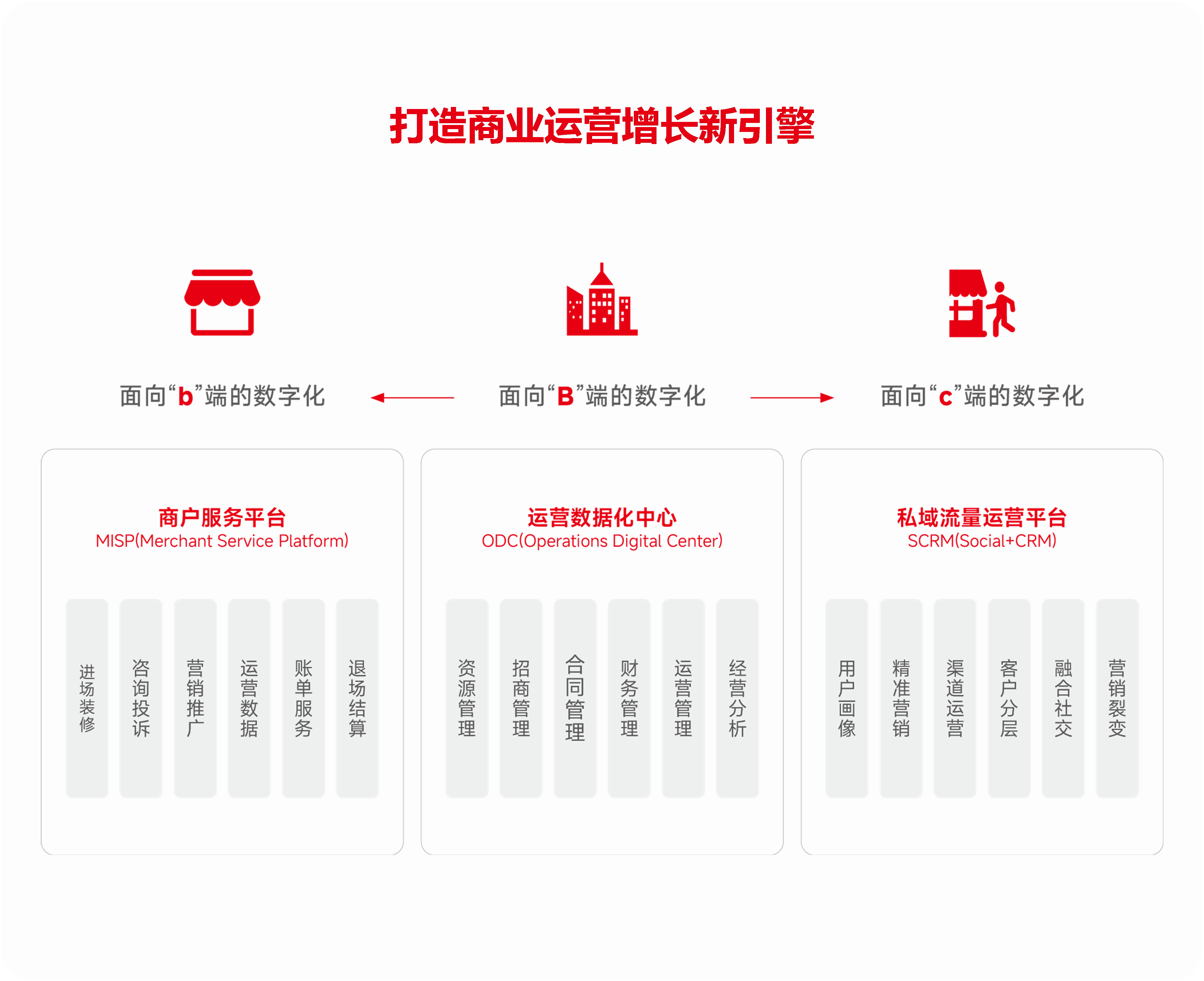 当前,受我国宏观经济环境下行压力及行业发展多方因素影响,商业地产等不动产运营企业面临着资金压力、政策压力及竞争压力等多重压力积压。用友基于成熟客户原型,打造支撑企业化、产业化、社会化场景的商业运营产品,可提供从招商管理、财务管理、租赁管理、物业管理一体化、全方位不动产资产管理和运营服务。