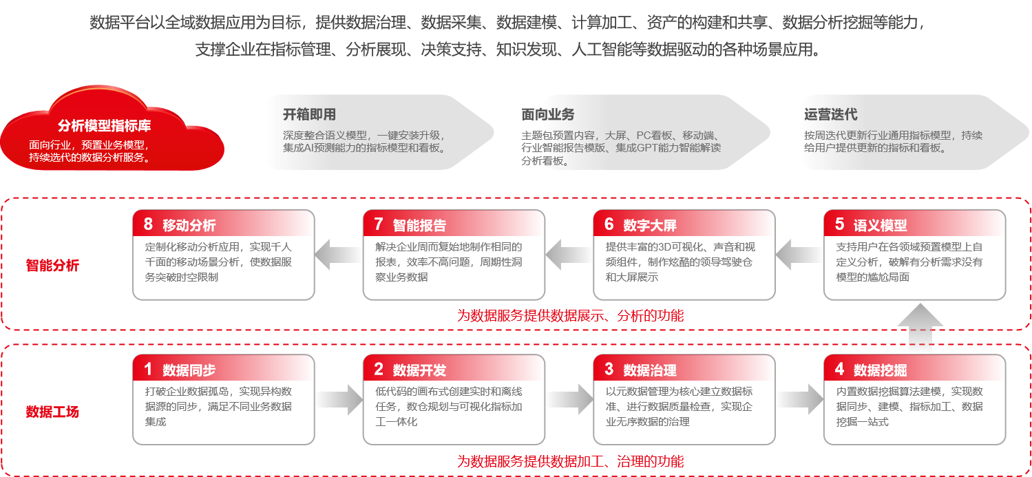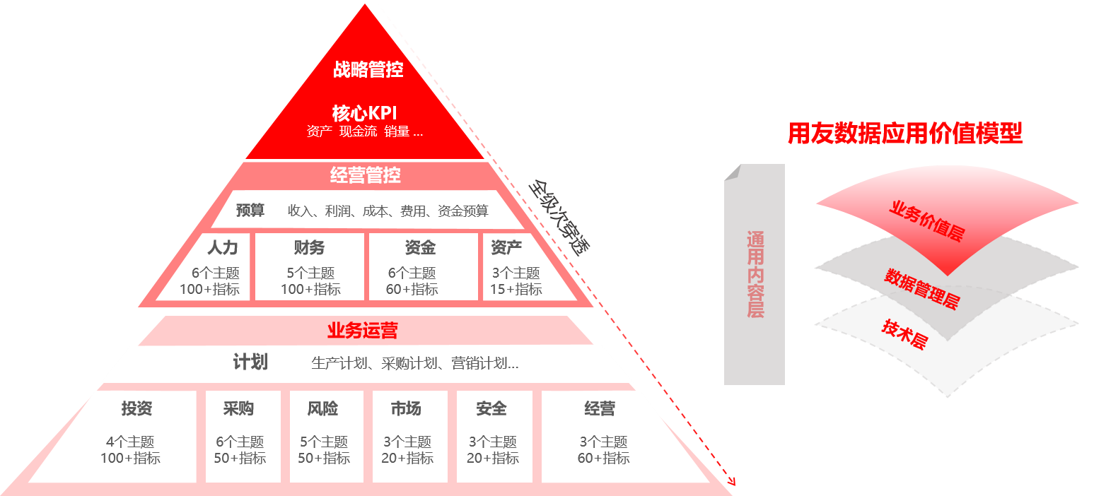 通过预置800+模型资产,包括财务(115)、商旅(37)、人力(35)、制造 (60)、采购 (43)、营销(112)、消费品(45)等十大领域主题分析,结合外部行业对标数据,凝聚用友35年管理沉淀,打造了一套深谙业务的数据架构体系。
